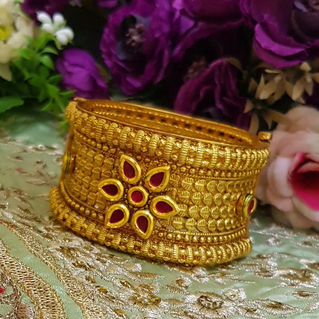 Step into royalty with our AristocratMatte Golden Rajwadi Kara, a symbol of regal opulence and exquisite craftsmanship. Each Kara is adorned with intricate Rajwadi patterns, exquisitely finished in a matte golden hue. Whether gracing a special occasion or adding flair to everyday wear, this Kara is a statement of aristocratic elegance. Elevate your style with the AristocratMatte Golden Rajwadi Kara and command attention wherever you go.