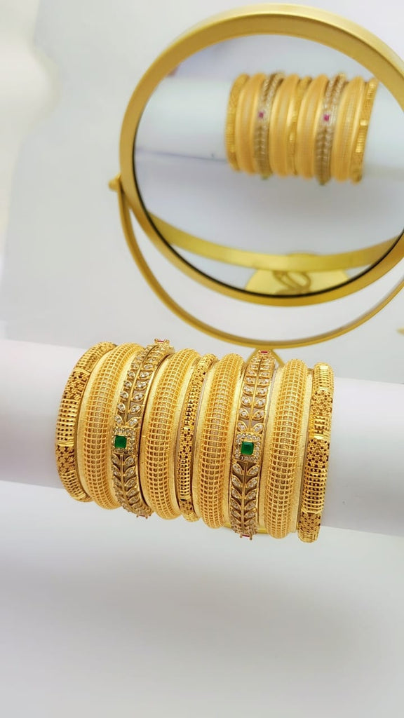 The Chic Golden Bangle Set brings a refined touch to any outfit with its stunning gold-tone finish. These gold-plated bangles offer the luxurious look of real gold, perfect for enhancing your style at weddings, birthdays, or casual outings. Crafted for both comfort and durability, these bangles are ideal for long hours of wear, whether you’re celebrating a special event or adding glamour to your everyday look.