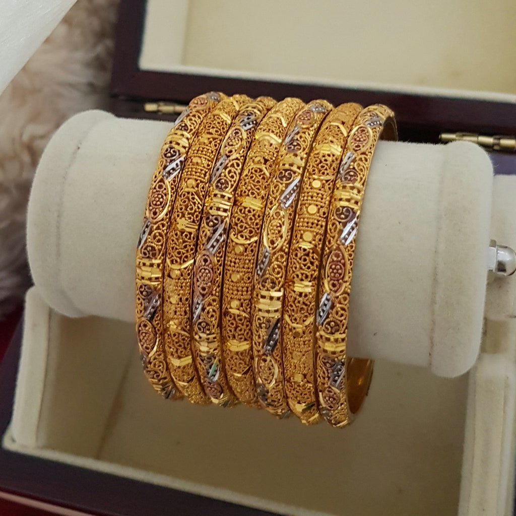 Embrace timeless charm with our Classic Gold Tone Traditional Bangles, designed to grace your wrists with enduring elegance. Each bangle in this set boasts a lustrous gold tone, radiating traditional allure and sophistication, making it the perfect accessory for any outfit. Whether worn individually for a subtle touch of sophistication or stacked together for a bold statement, these bangles epitomize timeless beauty and grace.