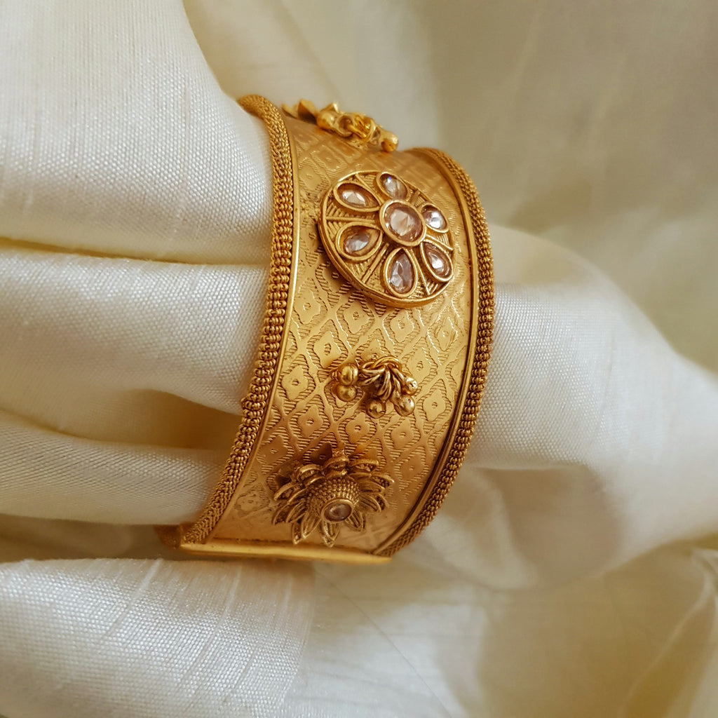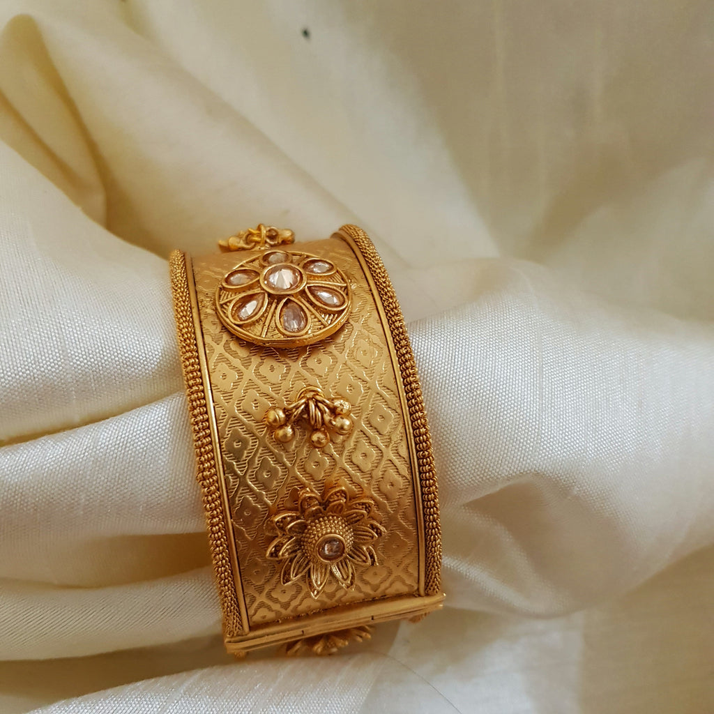Elevate your style with our EliteMatte Gold Color Rajwari Kara, a symbol of timeless elegance and sophistication. Crafted with precision, each Kara showcases exquisite Rajwari detailing, exuding regal charm and opulence. The matte gold color adds a touch of luxury, making it a versatile accessory for any occasion. Step into the spotlight and make a statement with the EliteMatte Gold Color Rajwari Kara, a true masterpiece of craftsmanship.