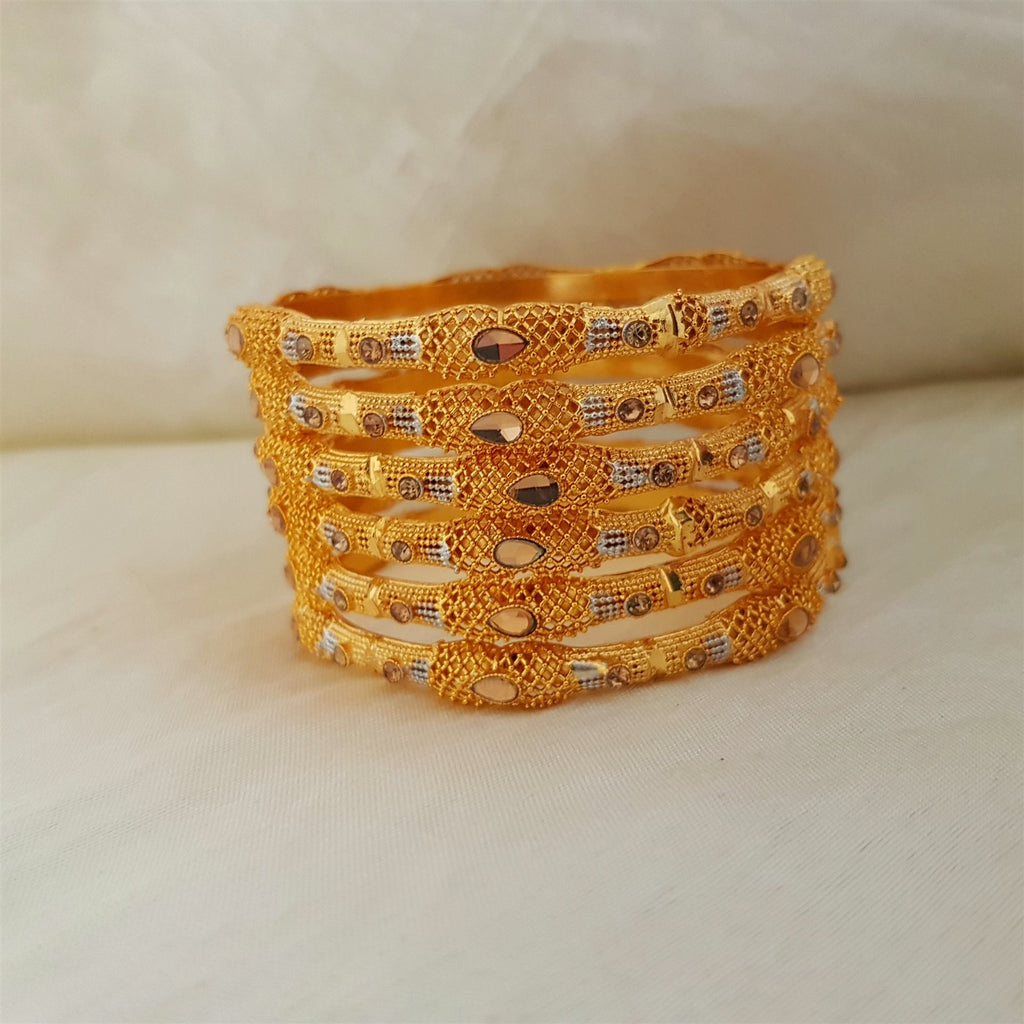 Indulge in the luxurious allure of our Gold Plated Fancy Bangles Set, a dazzling collection that combines the richness of gold plating with the sparkle of gemstones. Crafted from high-quality base metals like brass or copper and coated with a layer of opulent gold through electroplating, these bangles exude sophistication and glamour. The intricate setting of stones, such as crystals, cubic zirconia, or colored gems, enhances the visual appeal, creating a dazzling effect that catches the light. Perfect for special occasions, parties, or events, this versatile set offers a range of designs from classic to contemporary, allowing you to express your personal style with elegance and flair.