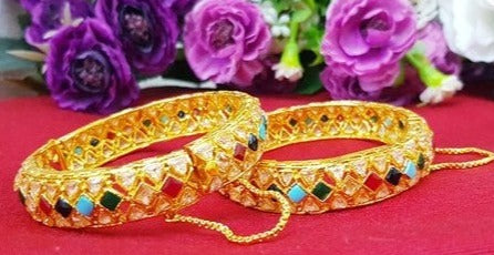 Embrace the beauty of nature with the Golden Blossom One Karat Bangles, each exuding a delicate charm reminiscent of blooming flowers. Adorned with a single karat of captivating allure, these bangles epitomize elegance and grace. Their timeless design effortlessly enhances any ensemble, ensuring you shine with floral sophistication on every occasion.