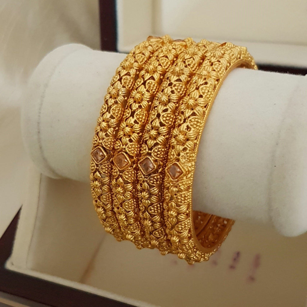 Elevate your style with the Golden Glide Gold Plated Bangles Set from Asianest. This exquisite set of bangles is beautifully plated in gold, offering a smooth and lustrous finish that glides effortlessly around your wrist. Perfect for any occasion, these bangles add a touch of elegance and sophistication to both traditional and modern outfits. Whether for a wedding, festive celebration, or a special evening out, this set is the perfect accessory to complete your look.