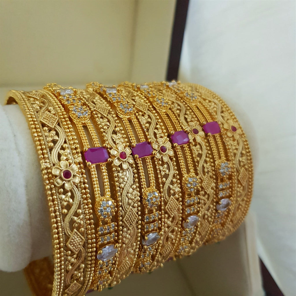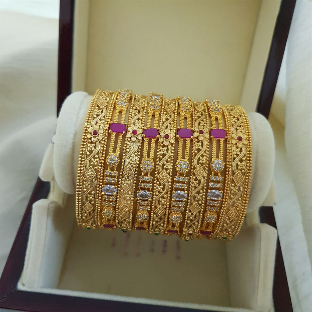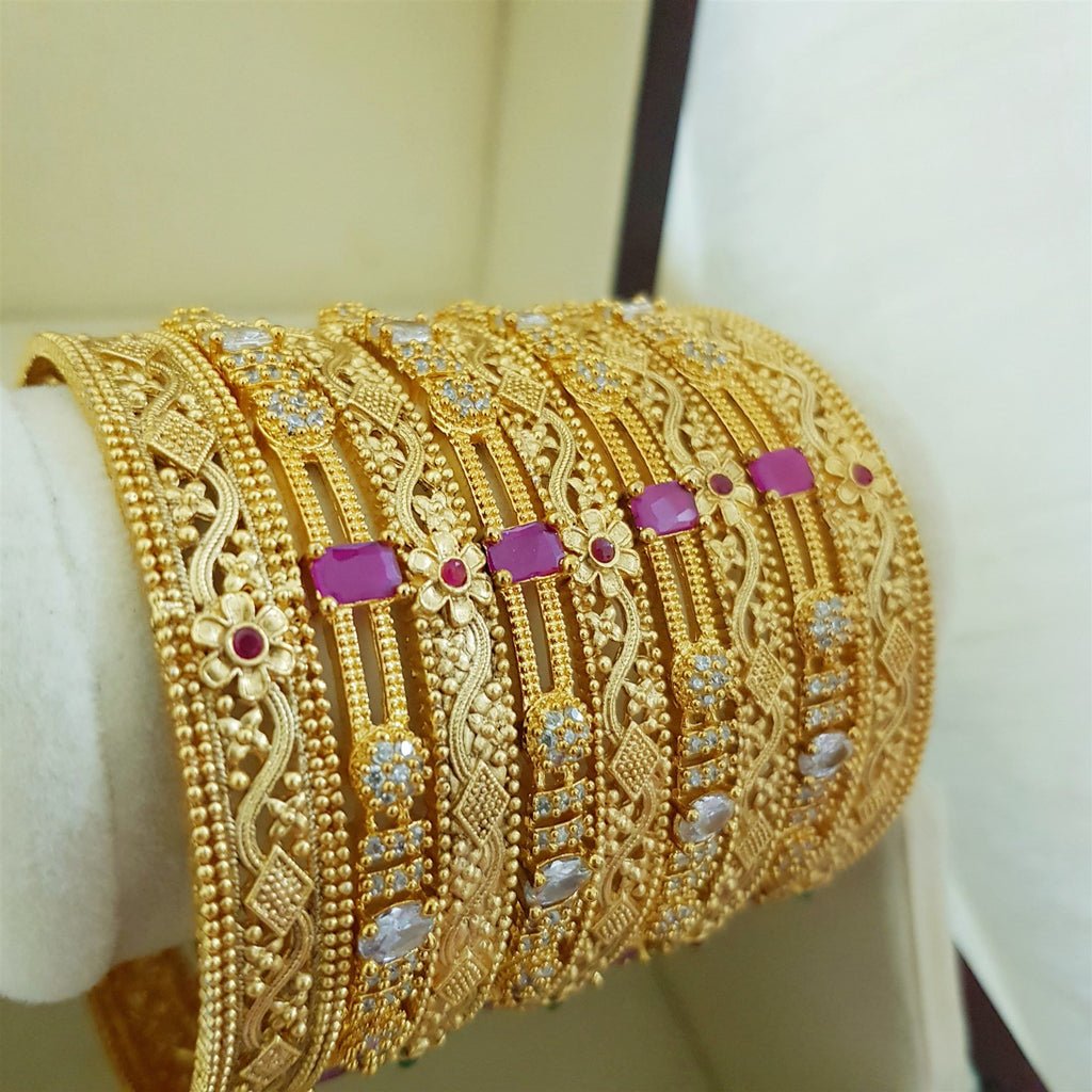 Emanate a radiant aura with our Golden Glow One Karat Bangles Set. Crafted with precision and elegance, each bangle in this set boasts a golden glow that adds a touch of opulence to your ensemble. Whether worn individually for a subtle accent or stacked together for a bold statement, these bangles elevate your style with their timeless charm and sophistication.